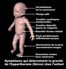 -Enlever les couches superflues de vêtements (ou de couvertures) de sorte que la chaleur puisse s'évacuer plus facilement du corps de l'enfant ; il faut toutefois agir sans excès, en ne retirant pas tous les vêtements au point de provoquer des frissons.